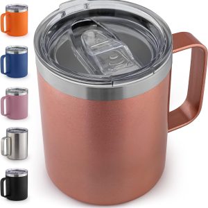 12 oz Insulated Coffee Mug with Lid - Stainless Steel Camping Mug Tumbler with Handle - Double Wall Vacuum Duracoated Insulated Mug For Travel, Camping, Office, Outdoor (Rose Gold) |