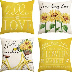 Colorlife Hollo Love Sunflower Bicycle Yellow Throw Pillow Covers, 18 x 18 Inch Flowers Summer Spring Cushion Case for Sofa Couch Set of 4 |