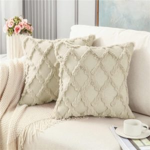 Corduroy Pillow Covers with Splicing Set of 2 Super Soft Boho Striped Pillow Covers Broadside Decorative Textured Throw Pillows for Spring Couch Cushion Livingroom 18 x 18 inch Beige |