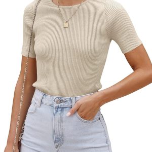 Women's Short Sleeve Crewneck Ribbed Knit Slim Fit T Shirt 2023 Summer Basic Solid Color Tee Tops |
